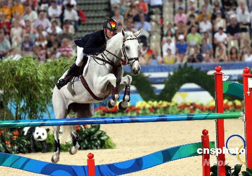 八月十二日,在香港舉行的奧運(yùn)馬術(shù)三項(xiàng)賽進(jìn)行最后一項(xiàng)場地障礙賽,德國選手欣里!け颂亍ち_邁克獲得個人賽金牌。中新社發(fā) 洪少葵 攝