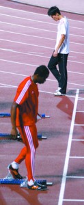 羅伯斯已經(jīng)去過(guò)“鳥(niǎo)巢”的賽道了,由于當(dāng)時(shí)現(xiàn)場(chǎng)只有幾個(gè)志愿者,沒(méi)有太多的記者,他顯得比較放松,甚至脫下比賽短褲,穿了一條內(nèi)褲坐在地上,用冰塊敷著身體。