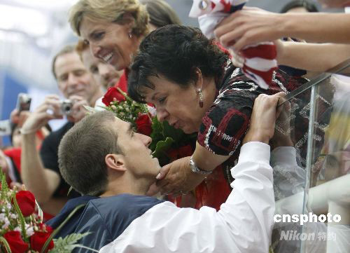 8月13日,美國(guó)游泳傳奇人物菲爾普斯,在北京奧運(yùn)會(huì)男子4乘200米自由泳接力中奪得自己奧運(yùn)會(huì)的第11枚金牌后,擁抱并親吻在“水立方”看臺(tái)上觀戰(zhàn)的媽媽黛比(Debbie)。 中新社發(fā) 杜洋 攝