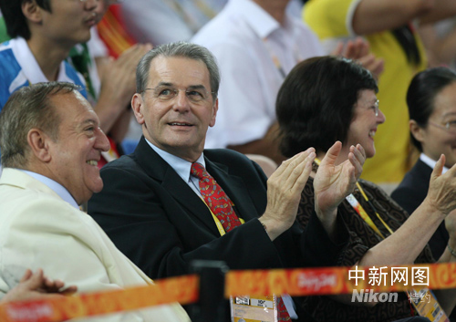 國際奧委會主席羅格在場下為打破世界紀(jì)錄的劉春紅精彩的表現(xiàn)鼓掌。中新社記者 武仲林 攝