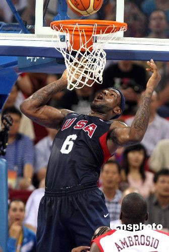 美國“夢八”隊在迎戰(zhàn)安哥拉的比賽中,“小皇帝”詹姆斯扣籃時亮出了胳膊上的紋身。中新社發(fā) 任晨鳴 攝