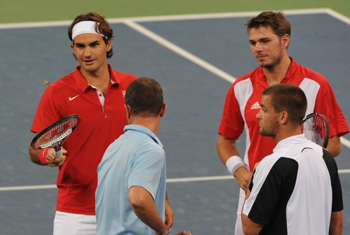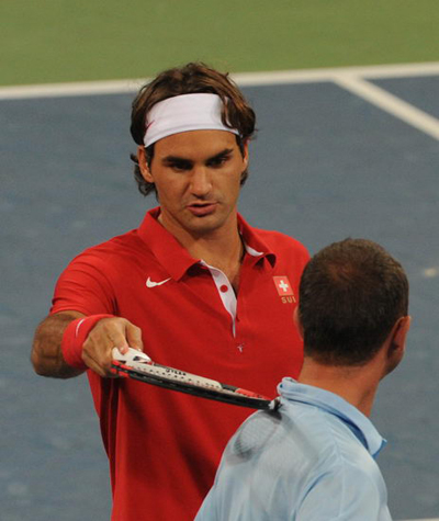 奧運(yùn)賽場花許多,在網(wǎng)球男雙第二輪比賽前,一只螞蚱飛到了裁判的后背上,“天王”費(fèi)德勒用球拍趕走了螞蚱。新華社記者邢廣利攝