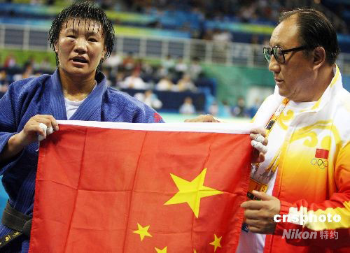 楊秀麗獲得金牌后,與中國柔道隊總教練劉永福向熱情的觀眾展示國旗。