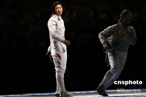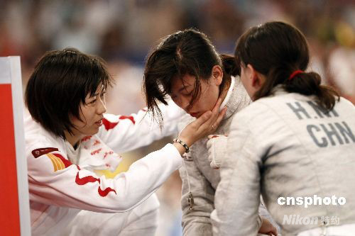 8月14日,北京奧運會女子佩劍團體冠亞軍決賽在北京國際會議中心擊劍館舉行,中國與烏克蘭爭奪冠軍。最后中國隊慘遭逆轉,以一分之差痛失金牌獲得第二名。 中新社發(fā) 盛佳鵬 攝