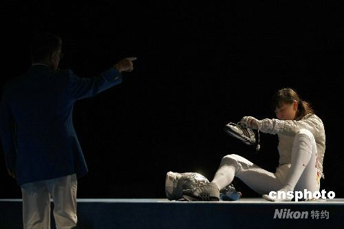 8月14日,北京奧運會女子佩劍團體決賽在國家會議中心擊劍館舉行。經(jīng)過三輪激戰(zhàn),中國隊以44 比45一分惜敗給黑馬烏克蘭隊,遺憾地獲得銀牌。激烈比賽中倪紅的鞋子脫腳而出。 中新社發(fā) 盛佳鵬 攝