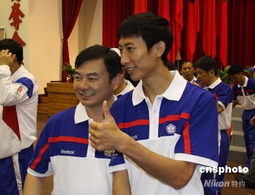 出征第二十九屆奧運會的中華臺北隊七月三十日在高雄左營運動選手訓(xùn)練中心正式成軍。圖為跆拳道選手朱木炎與教練蔡明志在儀式舉行后合影。 中新社發(fā) 曾嘉 攝