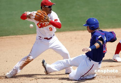 圖為中華臺(tái)北隊(duì)28號(hào)隊(duì)員羅國(guó)輝(右)在比賽中。