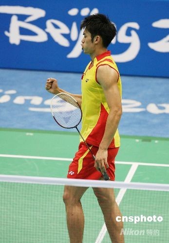 8月15日,中國選手林丹在北京奧運(yùn)會羽毛球男子單打半決賽中以2比0戰(zhàn)勝隊友陳金,進(jìn)入決賽。中新社發(fā) 武仲林 攝