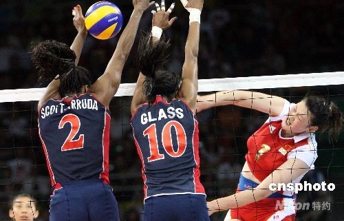 8月15日晚,北京奧運會女排小組賽中國與美國之戰(zhàn)在北京奧運會排球比賽館--首都體育館舉行,這場被戲稱為“和平大戰(zhàn)”的比賽最后時刻,兩名美國選手封死了中國隊王一梅的扣殺而以3比2戰(zhàn)勝中國女排。中新社發(fā) 任晨鳴 攝