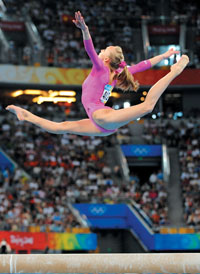 昨天中午,國(guó)家體育館中,女子體操全能決賽的最后一個(gè)項(xiàng)目是自由體操,美國(guó)選手柳金倒數(shù)第二個(gè)出場(chǎng),這位19歲女孩有著高挑的身材和柔美的氣質(zhì)。隨著一曲充滿俄羅斯風(fēng)情的《黑眼睛》,身著粉衣的柳金開(kāi)始了技驚四座的表演,只見(jiàn)她以一串又高又飄的跟頭精彩亮相,而后柳金憑借優(yōu)雅舒展的舞蹈和流暢而富有張力的動(dòng)作贏得了觀眾雷鳴般的掌聲,最后當(dāng)她以輕輕的踢腿動(dòng)作在場(chǎng)地上定格時(shí),全場(chǎng)沸騰了。盡管最后一名隊(duì)員肖恩還沒(méi)有上場(chǎng),但如此精彩的演出足以讓她得到金牌。