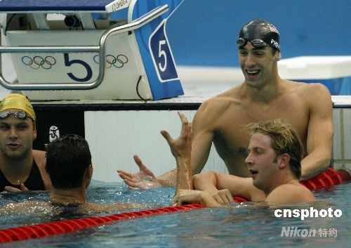 各國(guó)選手紛紛祝賀菲爾普斯創(chuàng)造的7金紀(jì)錄。