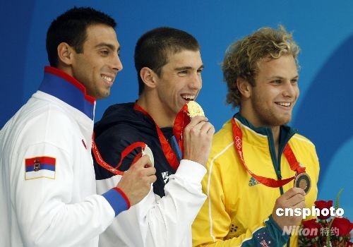 圖為美國(guó)選手邁·菲爾普斯(中)、塞爾維亞選手米洛拉德·查維奇(左)和澳大利亞選手安·勞特斯滕在男子100米蝶泳頒獎(jiǎng)儀式上,他們分別獲得這個(gè)項(xiàng)目的金銀銅牌。