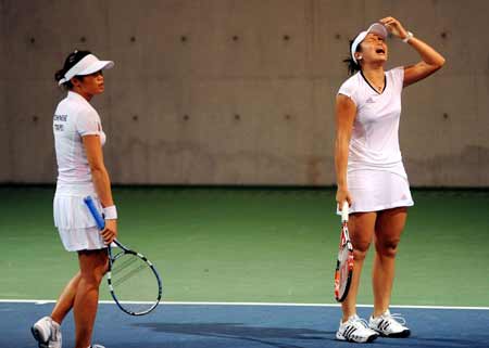 北京奧運會13日晚間進行女子雙打第二輪賽事,中華臺北選手莊佳容、詹詠然(右)敗給意大利選手遭淘汰。圖為在失利后,詹詠然流露出無奈的神情。(上圖)