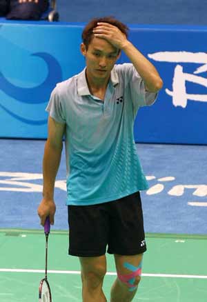 2008北京奧運會羽毛球項目14繼續(xù)日在北京工業(yè)大學體育館進行男子單打比賽,中華臺北隊選手謝裕興以2比0輸給陳金,止于八強。圖為謝裕興在被淘汰后再思考 (下圖)