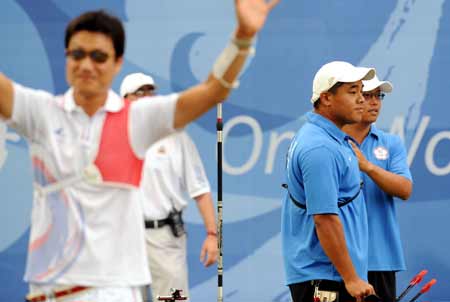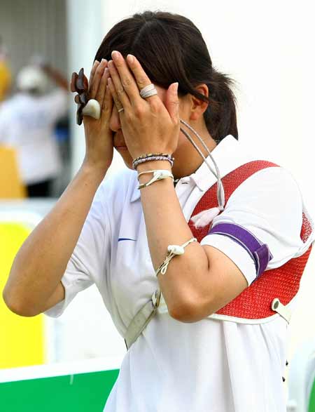 北京奧運(yùn)女子個人射箭賽12日在北京奧林匹克公園射箭場舉行,中華臺北隊吳蕙如輸給對手未能晉級,心情相當(dāng)難過。(下圖)