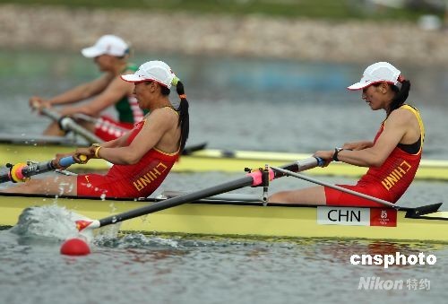 8月16日,中國選手吳優(yōu)、高玉蘭在北京奧運(yùn)會(huì)賽艇女子雙人單槳決賽中奪得銀牌。中新社發(fā) 武仲林 攝