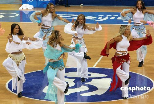北京奧運會男子籃球小組賽第四輪比賽8月16日在五棵松籃球館舉行,“北京夢幻之舞”拉拉隊的烏克蘭姑娘為觀眾表演新學的“中國功夫”。中新社發(fā) 任晨鳴 攝