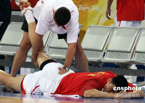 8月16日,北京奧運(yùn)會(huì)男子籃球小組賽第四輪比賽在五棵松籃球館舉行,為了爭(zhēng)奪小組出線權(quán)而躋身八強(qiáng)之列,由姚明率領(lǐng)的中國(guó)隊(duì)與由諾維斯基、卡曼率領(lǐng)的德國(guó)隊(duì)展開“生死大戰(zhàn)”之前兩小時(shí),中國(guó)隊(duì)就到達(dá)賽場(chǎng),姚明在場(chǎng)地內(nèi)一邊“偷窺”德國(guó)隊(duì)的訓(xùn)練,一邊接受火箭隊(duì)隊(duì)醫(yī)的專門治療。中新社發(fā) 任晨鳴 攝
