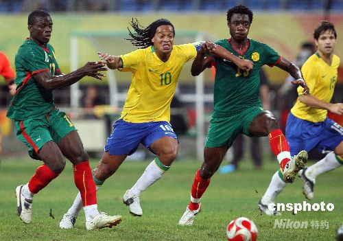 8月16日,北京奧運(yùn)會(huì)沈陽(yáng)足球分賽場(chǎng)舉行男足1/4決賽,巴西隊(duì)通過(guò)加時(shí)賽,以2:0戰(zhàn)勝喀麥隆隊(duì),進(jìn)入半決賽。圖為巴西隊(duì)球員羅納爾迪尼奧(左二)帶球突破。中新社發(fā) 張宇 攝