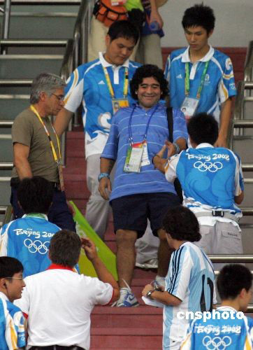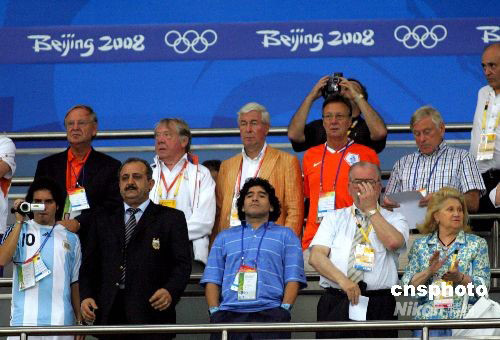 8月16日,北京奧運(yùn)會(huì)男足,阿根廷VS荷蘭的比賽在上海體育場(chǎng)進(jìn)行。球王馬拉多納親臨上海為阿根廷加油助威。中新社發(fā) 湯彥俊 攝