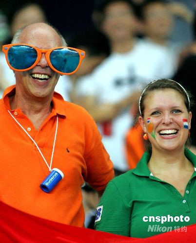 8月16日,北京奧運(yùn)會(huì)男足阿根廷對(duì)陣荷蘭的比賽在上海體育場(chǎng)進(jìn)行。一位荷蘭球迷帶著一副巨型眼鏡在比賽現(xiàn)場(chǎng)觀看比賽,吸引了不少好奇的目光。中新社發(fā) 湯彥俊 攝