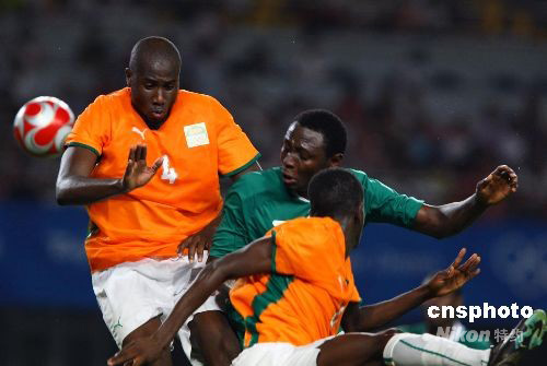 科特迪瓦隊(duì)4號班巴與尼日利亞隊(duì)員爭頂頭球。