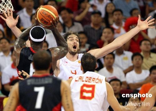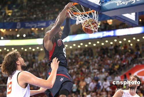 北京奧運(yùn)會男子籃球小組賽第四輪比賽8月16日在五棵松籃球館舉行,同為三戰(zhàn)三勝的美國“夢八隊(duì)”、世錦賽冠軍西班牙隊(duì),午夜時(shí)分展開驚心動魄的激情碰撞。最后美國隊(duì)以119比82擊敗西班牙隊(duì)。圖為韋德突破加索爾兄弟的防守扣籃。中新社發(fā) 任晨鳴 攝