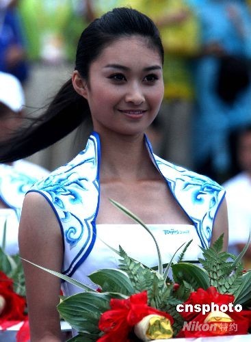 8月17日傍晚,北京2008奧運(yùn)帆船比賽在青島分賽場(chǎng)舉行,身著“青花瓷”頒獎(jiǎng)服窈窕的禮儀小姐格外搶眼。中新社發(fā) 趙振清 攝