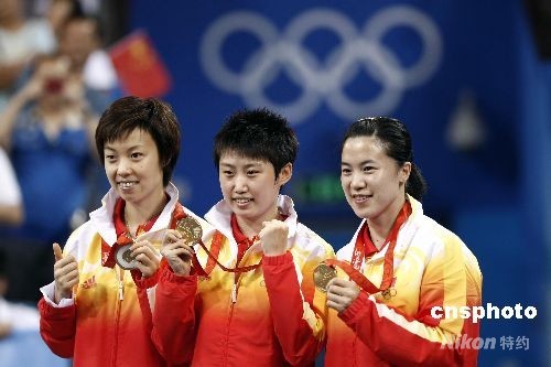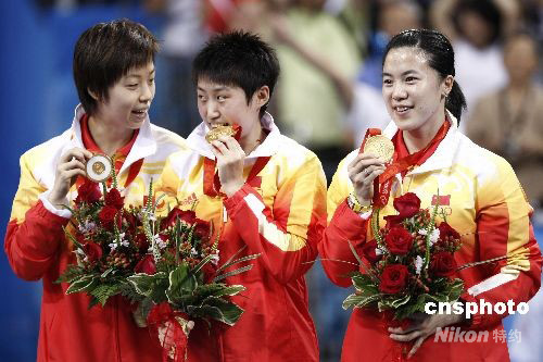 王楠、張怡寧和郭躍領(lǐng)獎臺上品嘗金牌味道。 中新社發(fā) 盛佳鵬 攝