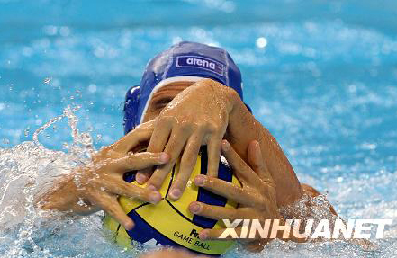 8月18日,在北京奧運(yùn)會(huì)男子水球預(yù)賽中,意大利隊(duì)以13比12戰(zhàn)勝塞爾維亞隊(duì),意大利隊(duì)球員萊奧納爾多·賓基試圖從對(duì)手手中搶球,這樣出現(xiàn)了三只手在搶球。新華社記者王慶欽攝