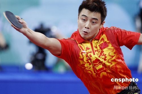 8月18日,北京奧運會乒乓球男子團體決賽在北京大學體育館舉行,王皓將為中國隊打頭陣,戰(zhàn)勝德國隊的新秀奧恰洛夫,為中國隊拿下第一分。中新社發(fā) 盛佳鵬 攝