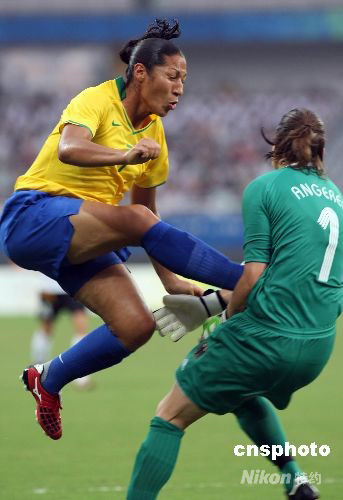 8月18日,北京奧運會女足半決賽,德國VS巴西的比賽在上海體育場進行。最終巴西隊以4:1大勝世界冠軍德國隊。激烈異常的比賽場面,讓觀眾領(lǐng)略了競技體育的“殘酷”。圖為巴西隊7號達妮埃拉沖撞守門員。 中新社發(fā) 湯彥俊 攝