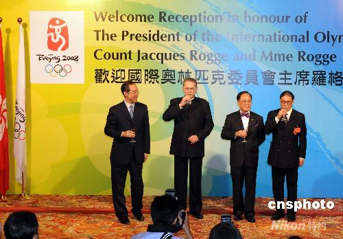 八月十八日,國際奧林匹克委員會主席羅格(左二)訪問香港,出席行政長官曾蔭權(quán)(左三)舉行的歡迎酒會,與政務(wù)司司長唐英年(左一)、香港奧委會主席霍震霆共同舉杯祝賀香港奧運馬術(shù)比賽成功。 中新社發(fā) 蔡蔓莉 攝
