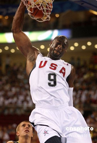 8月18日,北京奧運會男籃小組賽最后一輪賽事在北京五棵松籃球館舉行,此前四戰(zhàn)四勝的美國“夢八隊”以106比57橫掃由NBA巨星德克·諾維茨基率領(lǐng)的德國隊,隊中各員大將輪流上演扣籃絕技。美國隊的勝利確保了中國隊進入前八席位。圖為韋德在扣籃。 中新社發(fā) 任晨鳴 攝