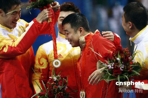 8月18日,2008年北京奧運會乒乓球男團決賽中國隊與德國隊的較量在北京大學體育館展開,中國隊憑借出色的表現,以3比0擊敗德國隊奪冠。圖為領獎臺上,王皓、王勵勤、馬琳將三塊金牌都歸功于教練劉國梁。