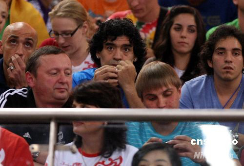 8月18日晚,“球王”馬拉多納駕臨北京五棵松籃球館,觀看北京奧運(yùn)會(huì)男籃阿根廷隊(duì)與俄羅斯隊(duì)之戰(zhàn)。中新社發(fā) 任晨鳴 攝