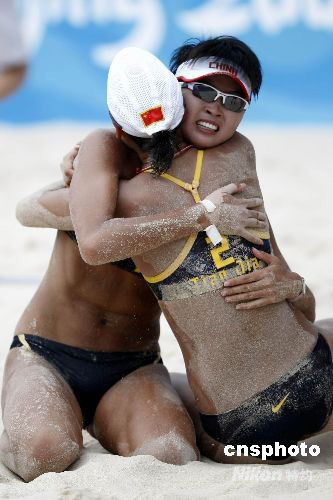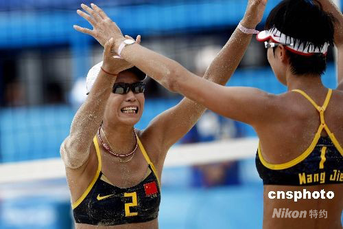 圖為王潔、田佳在慶祝晉級(jí)決賽。中新社發(fā) 盛佳鵬 攝
