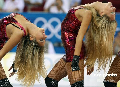 8月19日下午,北京奧運(yùn)會(huì)女子籃球四分之一淘汰賽在北京五棵松籃球館舉行,由烏克蘭金發(fā)美女組成的啦啦隊(duì),魅力四射,光彩照人。中新社發(fā) 任晨鳴 攝