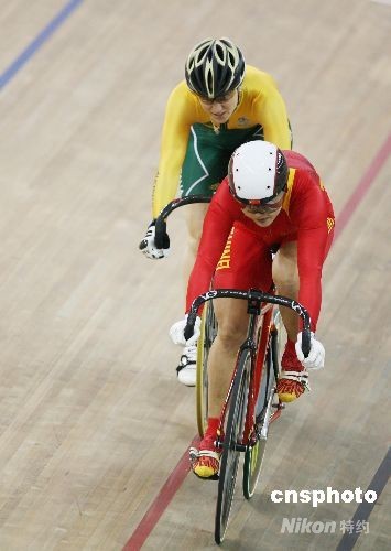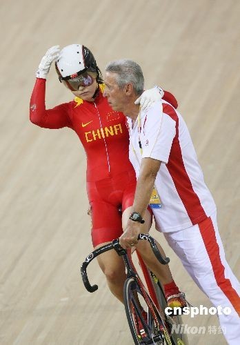 8月19日,2008北京奧運(yùn)會(huì)場(chǎng)地自行車女子爭(zhēng)先賽半決賽在老山自行車館進(jìn)行,中國(guó)自行車“希望之星”郭爽因第三戰(zhàn)決勝戰(zhàn)因?yàn)榕c對(duì)手米亞雷斯有身體接觸犯規(guī)被處罰取消成績(jī),因此遭逆轉(zhuǎn)惜敗無(wú)緣決賽,只能與荷蘭選手卡尼斯?fàn)帄Z銅牌。中新社發(fā) 武仲林 攝