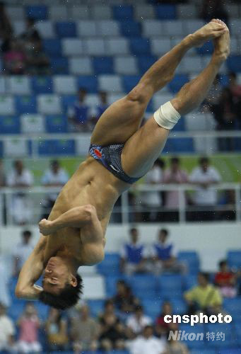 8月19日晚,在國家游泳中心“水立方”進(jìn)行的北京奧運會男子3米跳板決賽中,中國選手何沖以572.90分奪得金牌,中國代表團(tuán)金牌總數(shù)增至43枚。 中新社發(fā) 杜洋 攝