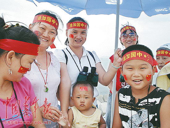 重慶市民李順鳳帶著一家祖孫三代七人來了,最大的成員是75歲的母親,最小的是牙牙學(xué)語的孩子。他們臉上貼著國旗和紅心,頭上系著“中國加油”,像是熱情的粉絲。