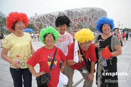 北京奧運(yùn)會吸引來自眾多國家的運(yùn)動員和熱情觀眾的參與,奧林匹克風(fēng)在北京奧林匹克公園激情上演。圖為中國百姓頭戴奧運(yùn)五色帽助興。中新社發(fā) 陳文 攝