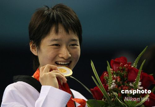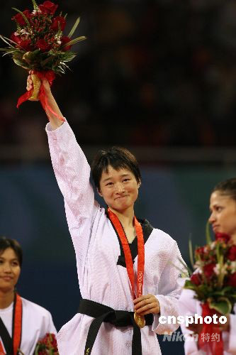 8月20日晚,北京奧運(yùn)會(huì)跆拳道女子49公斤級(jí)以下決賽在北京科技大學(xué)體育館舉行,中國(guó)選手吳靜鈺以1:-1戰(zhàn)勝泰國(guó)選手布特蕾·貝德蓬獲得冠軍,成為中國(guó)跆拳道在本屆奧運(yùn)會(huì)上奪得的第一枚金牌,也是中國(guó)代表團(tuán)在本屆奧運(yùn)會(huì)上獲得的第45枚金牌。 中新社發(fā) 武仲林 攝