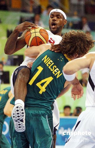 北京奧運(yùn)會(huì)男子籃球八進(jìn)四淘汰賽8月20日在五棵松籃球館開(kāi)戰(zhàn),美國(guó)“夢(mèng)八隊(duì)”遭遇澳大利亞隊(duì)的頑強(qiáng)抵抗,最后以116比85擊敗澳大利亞隊(duì)進(jìn)入奧運(yùn)會(huì)男籃四強(qiáng)。中新社發(fā) 任晨鳴 攝