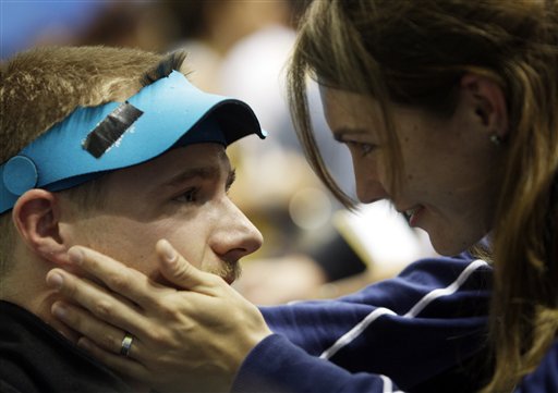 全場(chǎng)愕然。一個(gè)令人難忘的畫面出現(xiàn)了:埃蒙斯的妻子卡特琳娜先是茫然,然后眼神柔和下來,探身上前,將埃蒙斯攬?jiān)趹牙。一?huì)兒,埃蒙斯回過神來,與其他射手和裁判打過招呼,走出去,中途不停地接受記者的問詢。埃蒙斯還帶著笑容,雖然有些苦澀。