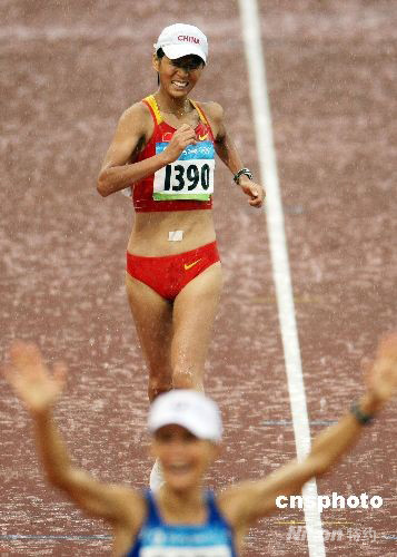 北京奧運(yùn)會(huì)女子20公里競(jìng)走8月21日上午在大雨中舉行,中國(guó)選手劉虹最終成績(jī)?yōu)?小時(shí)27分17秒,名列第四,無(wú)緣獎(jiǎng)牌。中新社發(fā) 任晨鳴 攝