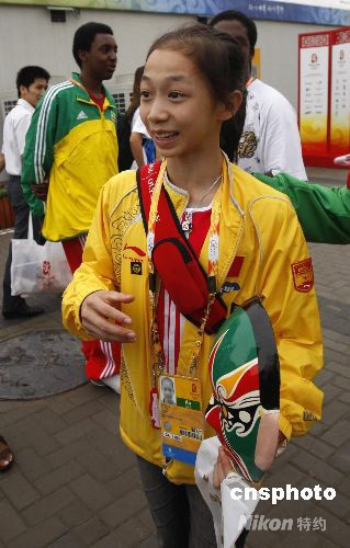 8月21日,北京奧運(yùn)會體操冠軍、中國選手楊伊琳,在北京奧運(yùn)村一邊逛街一邊尋覓自己喜歡的紀(jì)念章進(jìn)行交換。 中新社發(fā) 杜洋 攝