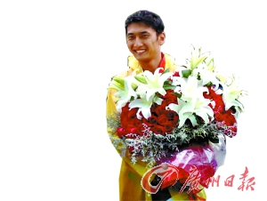 昨天,女子沙灘排球頒獎儀式在大雨中隆重舉行,之后三對獲獎選手陸續(xù)走過混合區(qū)。此刻,混合區(qū)外邊一個獨特的“景致”吸引了大家的注意:一個高大帥氣的小伙子手捧一束玫瑰,安靜地等待著。他正是田佳在八一沙排隊的隊友兼男友鄭鴻勇(見右圖),“本來不讓他來看比賽,不過到了16進8的淘汰賽后他非得要來,那我就找來票給他,每次他都坐在我可以找到的地方!边@也揭開了大家的一個疑問,從淘汰賽開始,田佳每贏得一場勝利都會沖著觀眾席的某一個方向送出飛吻,原來,她是有“目標(biāo)”的。