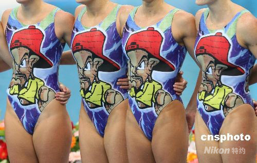 8月22日,北京奧運(yùn)會(huì)花樣游泳集體技術(shù)自選比賽在國家游泳中心舉行,西班牙隊(duì)名列第二。圖為西班牙隊(duì)別致的泳裝,引人注目。 中新社發(fā) 武仲林 攝