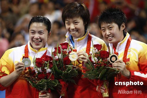 8月22日晚,在北京大學(xué)體育館進(jìn)行的北京奧運(yùn)會乒乓球女子單打決賽中,中國乒乓球名將張怡寧以4-1戰(zhàn)勝自己的隊(duì)友王楠,為中國代表團(tuán)贏得本屆奧運(yùn)會第47枚金牌。王楠獲得銀牌,另一名中國選手郭躍獲得銅牌。 中新社發(fā) 盛佳鵬 攝